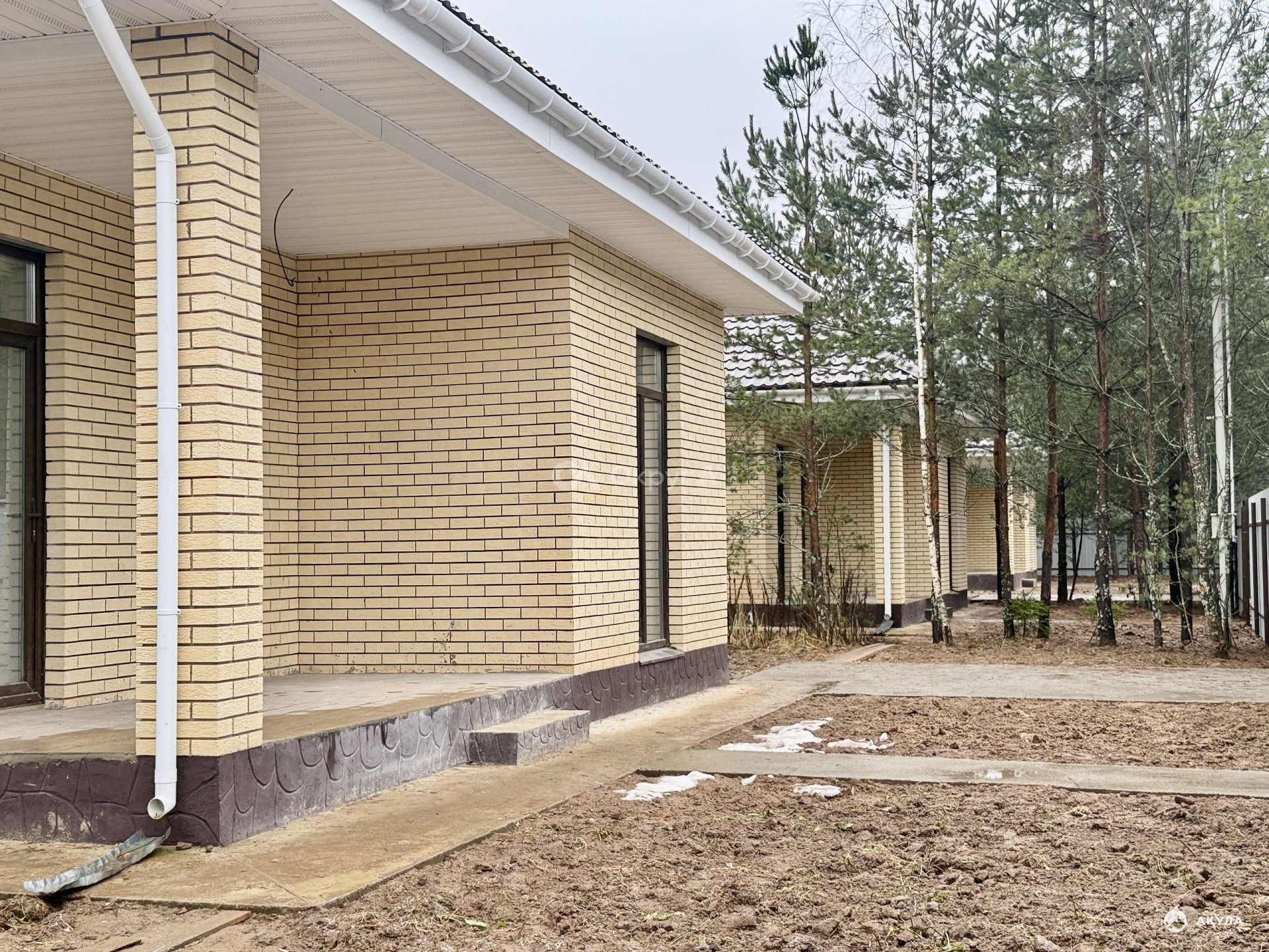 Материал стен — блок, фасад облицован кирпичом, фундамент — монолитная плита. Панорамное остекление наполняет пространство естественным светом и создаёт ощущение простора.